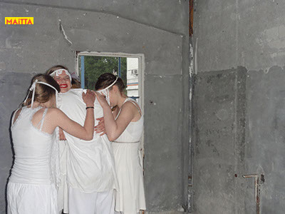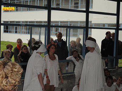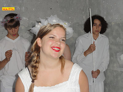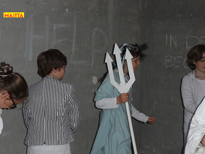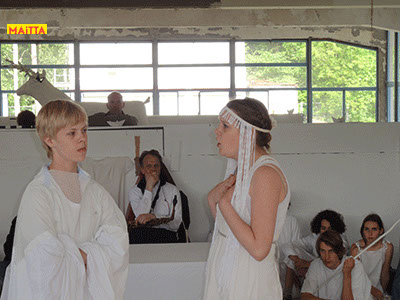 We hebben een periode van januari tot juni waarin we met alle groepen van de Jeugdtheaterschool samen één voorstelling gaan voorbereiden. Het wordt de voorstelling Iph & ik, geïnspireerd op het toneelstuk van Pauline Mol ‘Iphigeneia, koningskind’ en de teksten van Euripides. Het zal op 22 en 23 juni in de Beukenlaan en het Openluchttheater te Zonnestraal uitgevoerd worden. Het publiek loopt langs verschillende taferelen en maakt zo de vervloeking van Tantalus, het ontstaan van de twistappel, het Parisoordeel en uiteindelijk het onmogelijke offer van Iphigeneia mee.