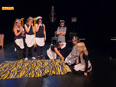 Op een gegeven moment zijn er ‘lievelingsverhalen’ ontstaan. Samen hebben we gekeken of we daar stukjes uit konden halen om verder te onderzoeken en uit te breiden. Uiteindelijk zijn we met elkaar gaan ‘schrijven’. We hebben een denkbeeldige kapstok gekozen waar we onze lievelingsrollen en -verhalen aan hebben opgehangen, en uiteindelijk zijn we dit gaan voorbereiden voor een publiekspresentatie. Daarbij was het oefenen met speltechnieken zoals o.a. rolopbouw (hoe ziet jouw personage eruit en hoe kan je elementen van jouw personage vergroten? Wat doet kostuum? Maakt het je deftig, oud, gemeen?), ritme (hoe verandert een scène als we er ineens een stilstand in doen? Of een stukje heel snel of juist langzaam spelen?) en herhalen (we doen als groep bepaalde handelingen die we telkens terug laten komen) heel belangrijk.