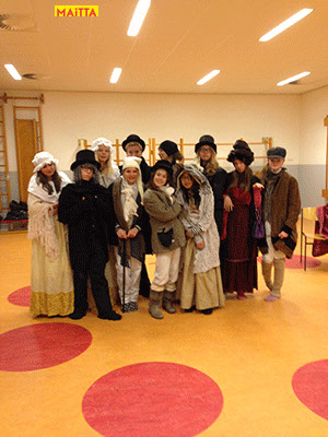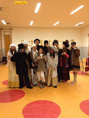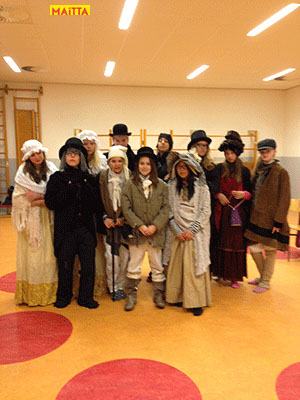 Samen met de leerlingen bekijken we afbeeldingen uit de beeldende kunst die ‘onze periode beslaan’, of bekijken we films. Inmiddels zijn er al heel wat ‘kostuumboeken’ aangeschaft. Dit jaar was Maitta zelfs speciaal naar Londen en Straford-upon-Avon gegaan om zich te laten inspireren door Shakespeare en Dickens.