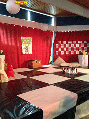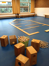 Maitta: Nadat de boterham is opgegeten komen de kinderen naar het speellokaal. Daar treffen ze meestal de start van een decor aan. Soms zijn er lijnen afgetaped op de vloer, soms staat er zomaar ineens een kasteel midden op de vloer. Ik probeer altijd iets te vinden wat hun nieuwsgierigheid wekt, waardoor hun fantasie geprikkeld wordt. Er volgt dan een korte uitleg, verpakt in een klein inleidend spel, zodat spelenderwijs de spelregels of kaders worden aangegeven waarmee de kinderen zullen werken. En meteen daarna kan ieder op zijn eigen manier aan de slag.