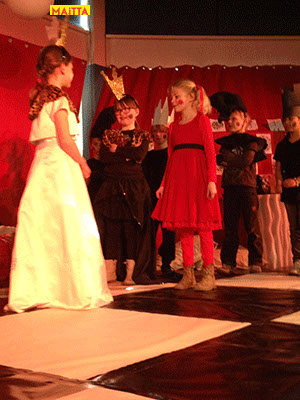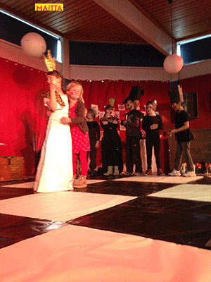 Al in 2006 had Maitta leiding gegeven aan een schoolbreed theaterproject op basisschool De koningin Emmaschool te Bussum. In maart 2014 werd Maitta opnieuw teruggevraagd voor een drie weken lang durend Emmatheaterproject. Het doel was het docententeam inspireren tot en het ondersteunen bij het toepassen van allerlei theatertechnieken in de klas. Hiervoor waren verschillende bijeenkomsten gepland met het team en aparte docenten. Daarnaast kregen alle klassen een aantal workshops van Maitta. Vervolgens werkten de klassen het geboden materiaal verder uit. In samenwerking met de superleuke ouderraad resulteerde dit alles in de voorstelling ‘Lang leve de Koningin’. In het beeldmateriaal zie je met hoeveel toewijding de kinderen hun kostuums en decor gemaakt hebben! Het was echt een fijn en leerzaam project!