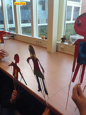Vlak voor de voorjaarsvakantie werden in alle groepen poppenvoorstellingen gegeven aan ouders, opa’s en oma’s. In de week ervoor hebben ze als opening van de kunstweek zelf een poppenvoorstelling gezien. Daarna zijn ze in de groep, met hulp van Maitta (theaterschool in Hilversum) scripts gaan schrijven en poppen gaan maken. Op onze Facebookpagina staan foto’s van de poppen en de verschillende voorstellingen.
